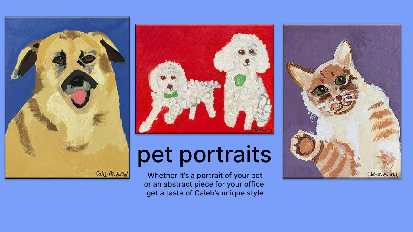 Whether it’s a portrait of your pet or an abstract piece for your office, get a taste of Caleb’s unique style.